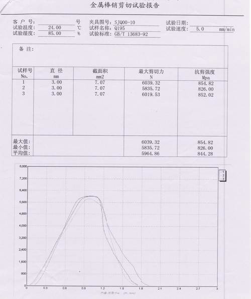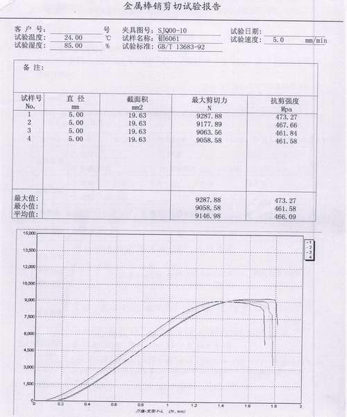 6061鋁金屬棒銷剪切試驗報告內(nèi)容:①直徑 截面積 ②最大剪切力 ③抗剪強度